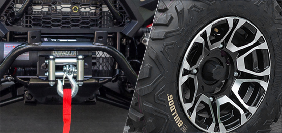 Hozzárendelhető 4x4-es hajtás elektromos differenciálzárral, 3000 font súlyú elektromos csörlő távirányítóval, vonószerkezet, dizájnos ALU kerekek márkás gumikkal, masszív első és hátsó bukókosár, robusztus első és hátsó fogasléc, robusztus acél első lökhárító, kar és kézi burkolatok, LED- Mátrix fényszórók, akusztikus villogó lámpák.